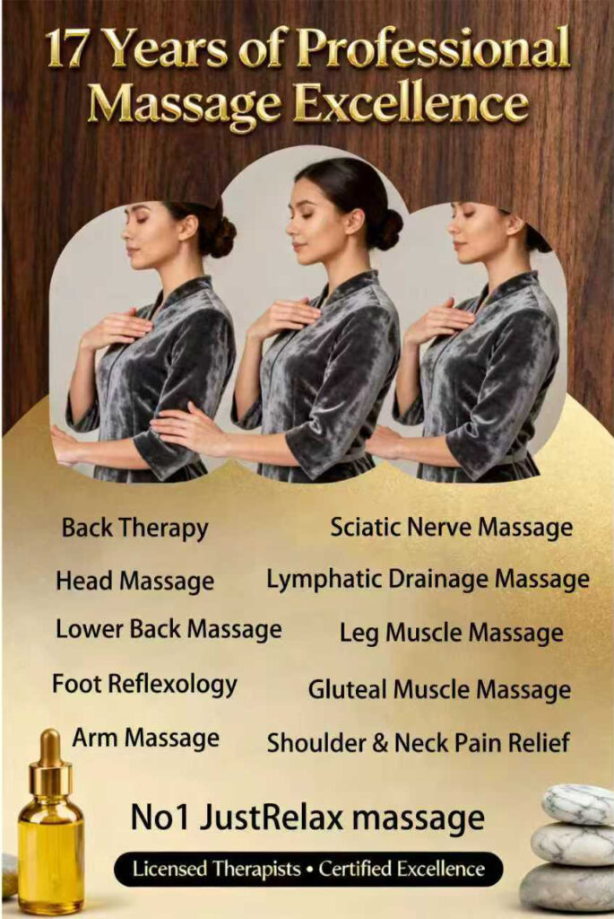 At No1 Just Relax,we invite you to indulge in pure relaxation and rejuvenation.With 17 years of experience in the massage industry,our expertise shines through in every session.We specialize in a diverse range of massage techniques,including Swedish,deep tissue,Lomi Lomi,Thai,and more.Our skilled therapists are committed to providing personalized,therapeutic experiences tailored to your unique needs.Whether you’re looking to relieve stress,soothe muscle tension,or simply unwind,No1 Just Relax is your sanctuary.Discover the power of touch and let us guide you to a state of pure bliss.